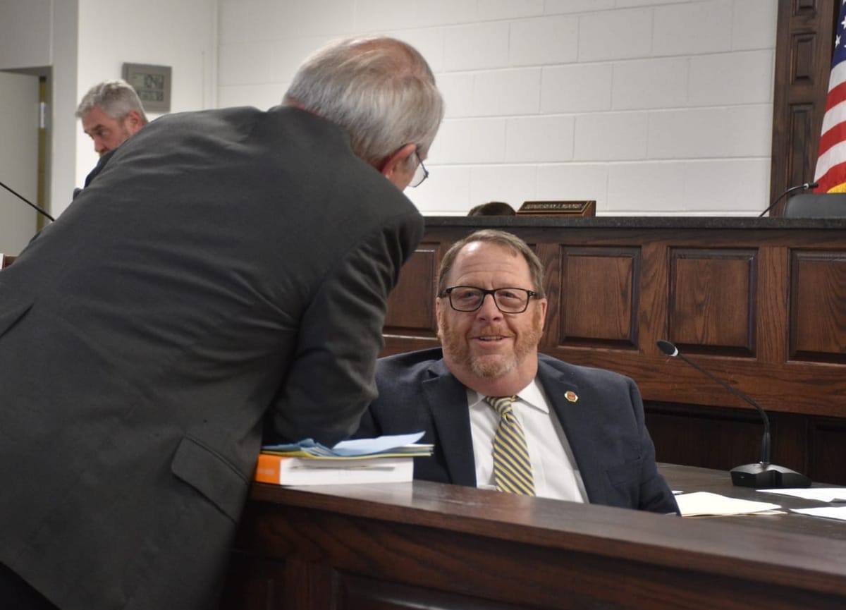 Rob Nunley photo - Retiring Deputy District Attorney General Ed Ryan shares a light moment with defense attorney Tom Miner during his final day in the courtroom Tuesday.