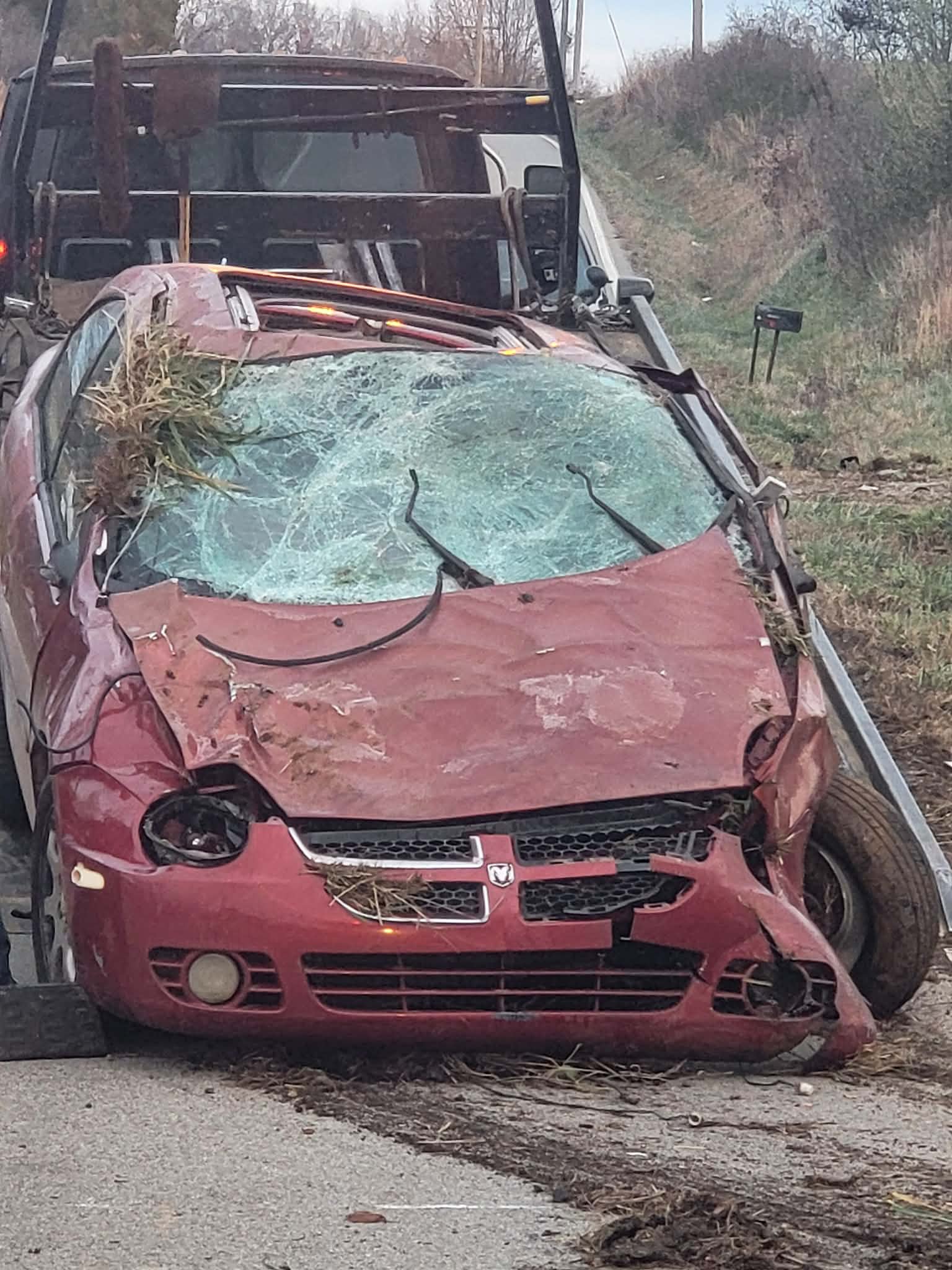 The driver, identified as Tyler Rice, was traveling southbound in the Dodge Neon when his vehicle crossed the center line and exited the left side of the roadway. The vehicle then struck a ditch and a culvert, causing it to overturn before coming to a final resting point in the ditch line.