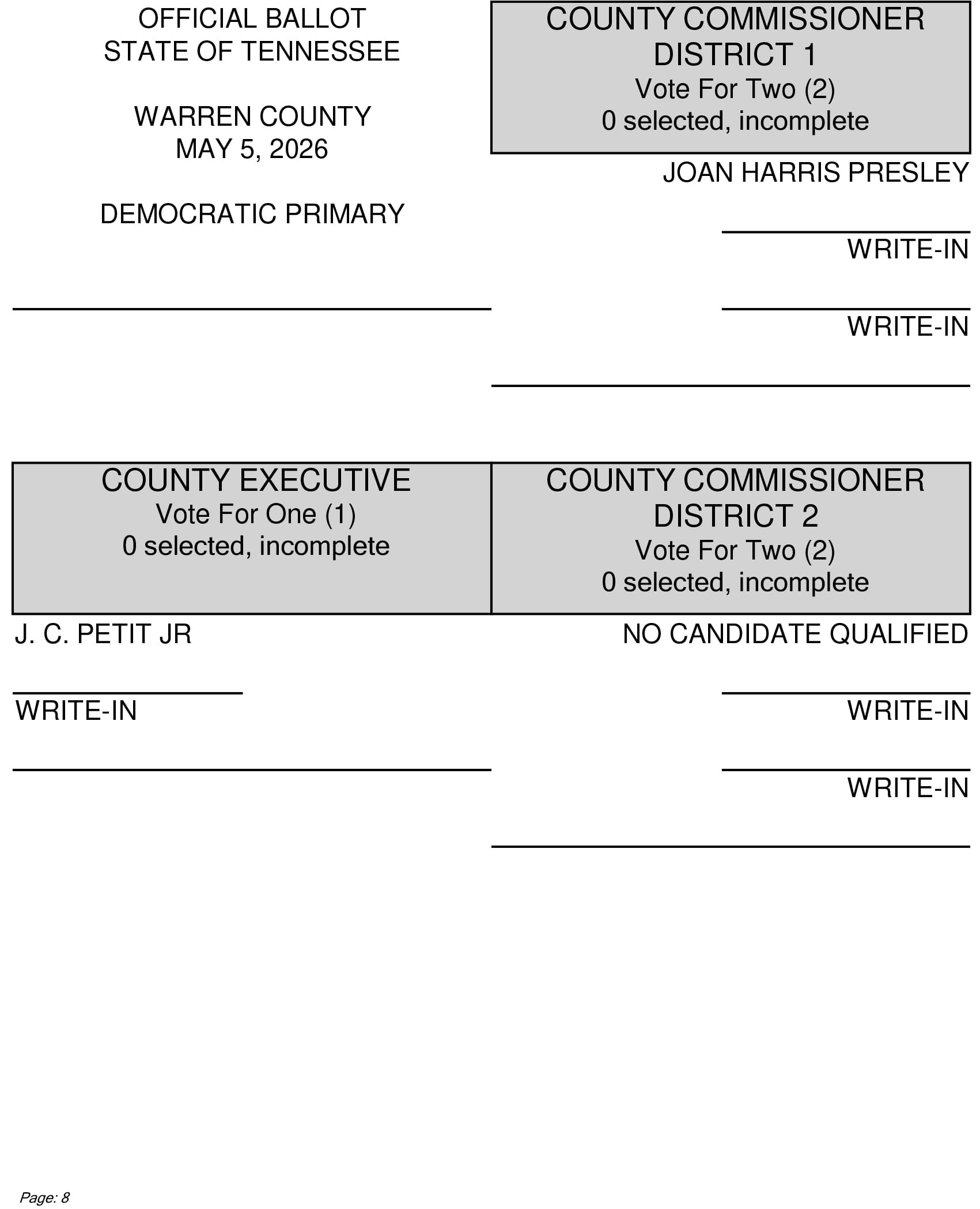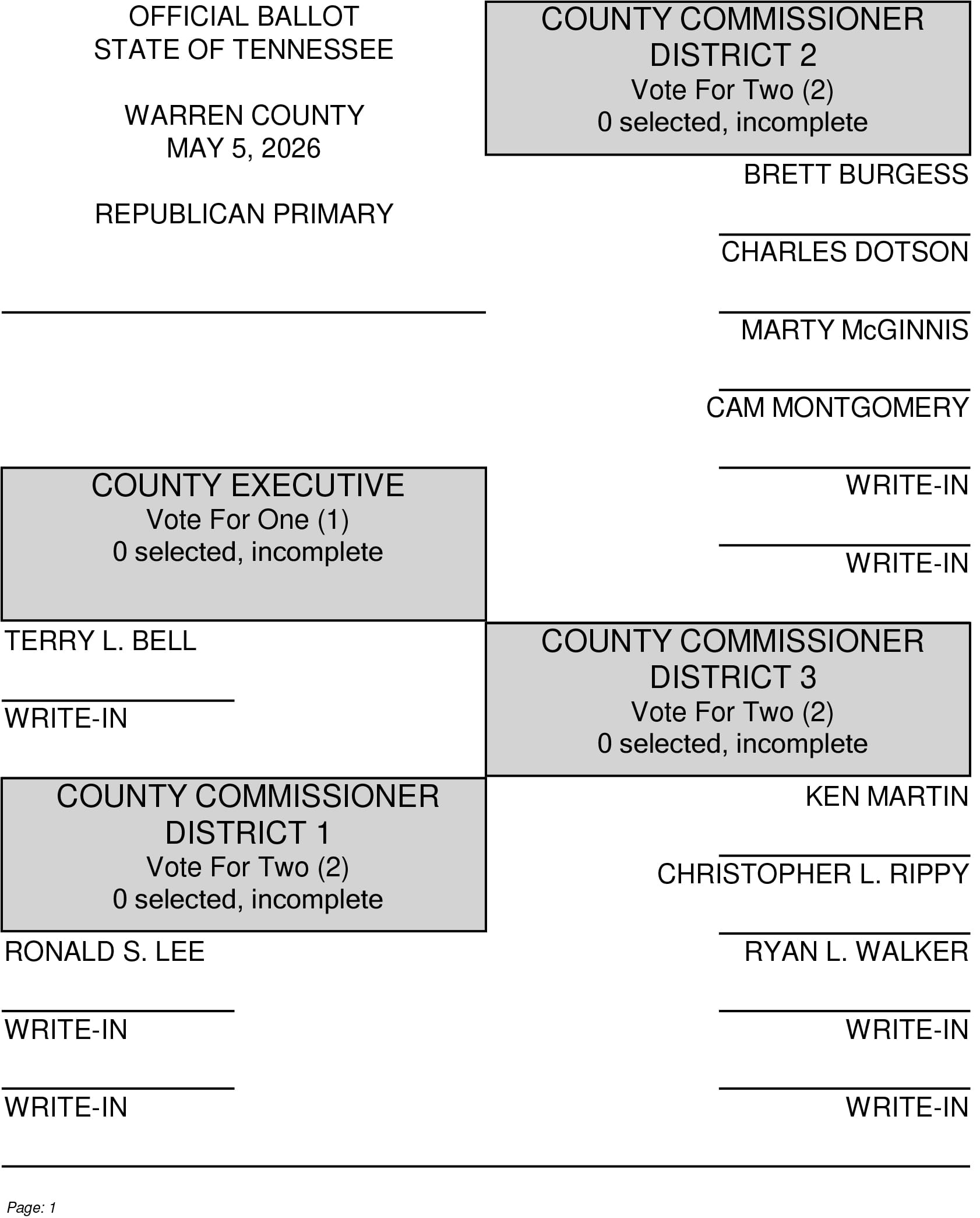 More information, including sample ballots and additional election details, is available at GoVoteTN.gov or by contacting the Warren County Election Commission.