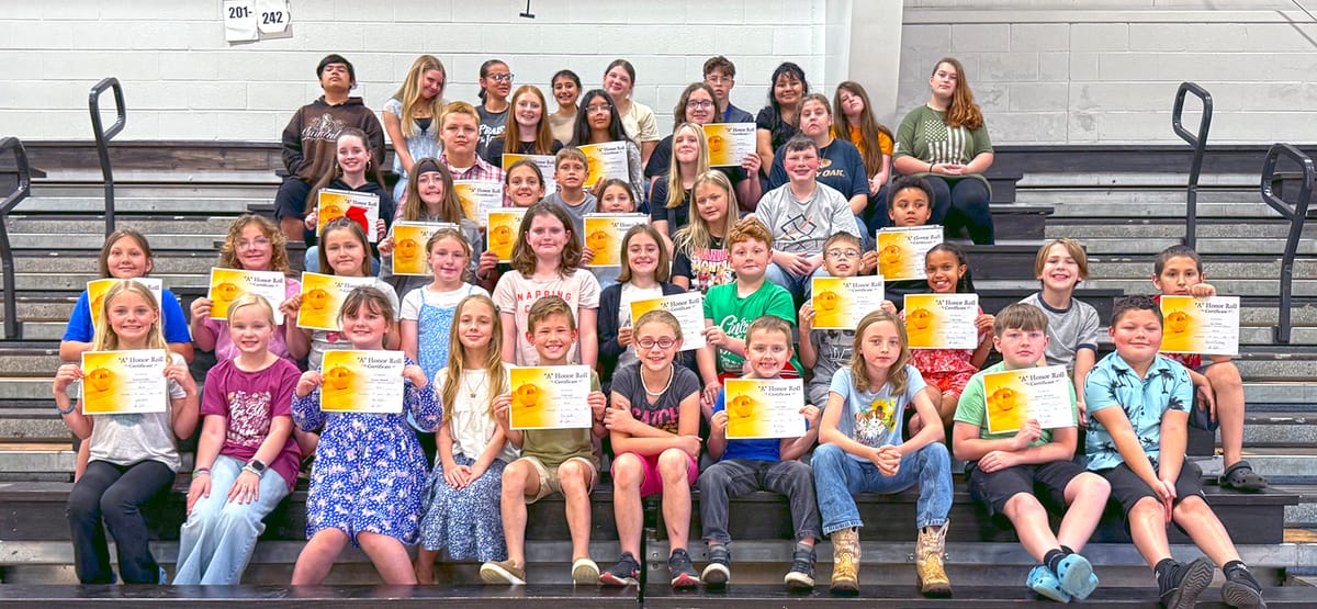 All A's Honor Roll - Front row, from left, Kamryn Locke, Ada Crouch, Journey Bennett, Veronica Parton, Noah Acre, Mallory Priddy, Jace Gann, Sienna Barnes, Jackson Woodlee and Ian Puentes-Roldan. Second row, Jude Elrod, Katelyn Youngblood, Brinsleigh Yates, Emery Hankal, Charlie Duncan, Sabriel Cotten, Silas Gibson, Eli Johnson, Colbi Crisp, Daniel Ramey and Jace Plante. Third row, Cattibrie Cotten, Virginia 'Pepper' Cooper, Serena Adams Treadway, Elah Cole and Kendrick Jones. Fourth row, Lily Houston, Hayden Mullican, John Kelly Simmons, Kirra Ferrell and Aiden Frederick. Fifth row, Arya Cotten, Megan Sanchez, Liam Black and Arra Campbell. Sixth row, Erick Gonzalez, Layleigh Mullins, Analiyah McBee, Isabella Rodriguez, Natalee Herren, Benetio Nisbet, Zoey Rodriguez, Jessica Gribble and Gracey Brown.