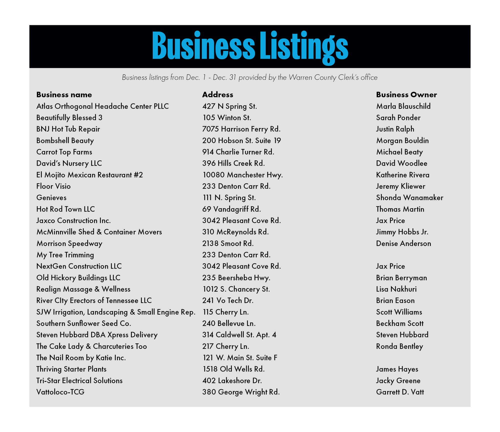 Before you go, check out the December business listings below.