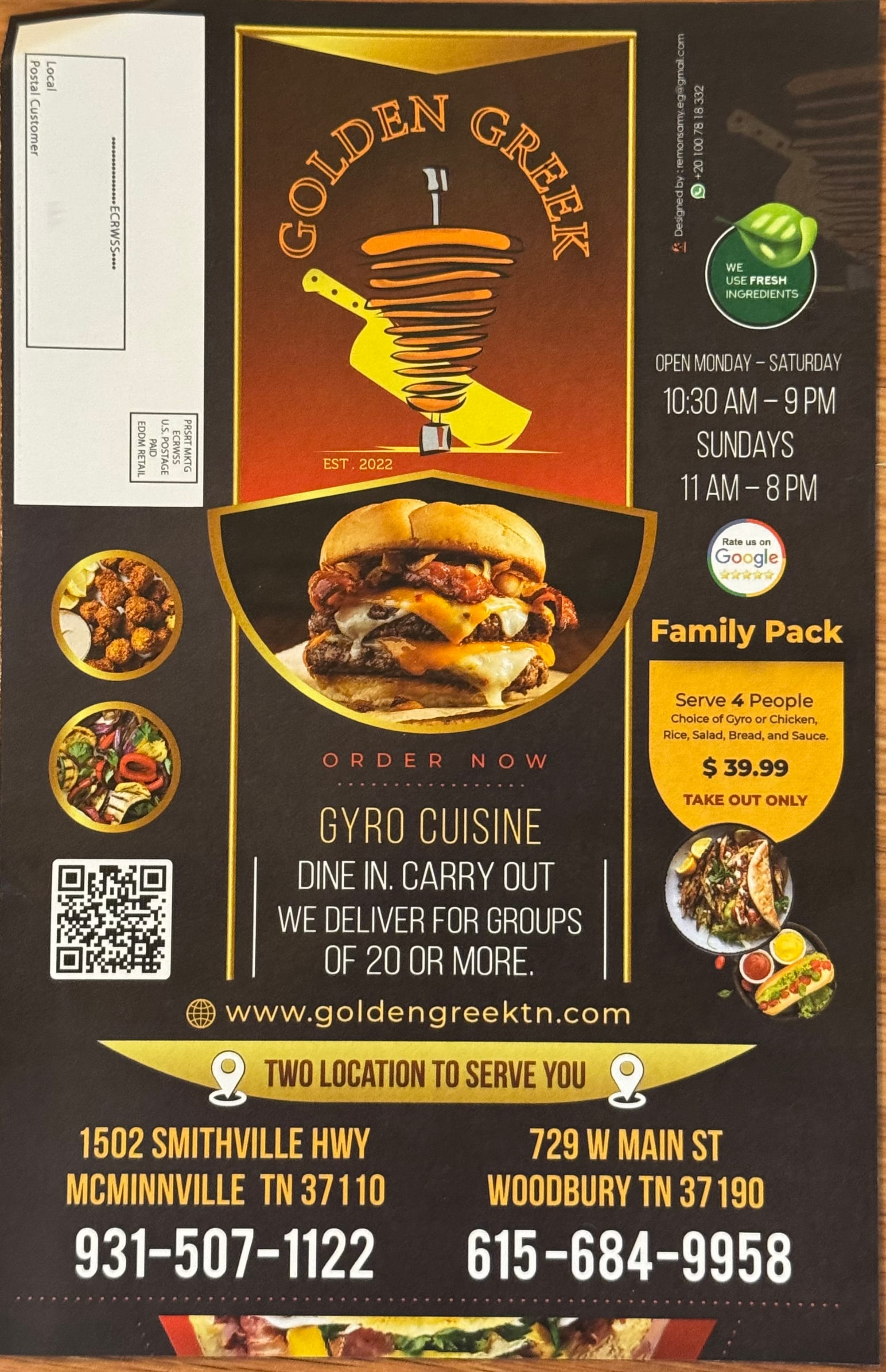 The much-anticipated opening of Golden Greek at 1502 Smithville Hwy. in the building formerly occupied by Coffee Bank & Trust happened Friday. I went by Saturday evening and was happy to see a jam-packed restaurant full of people enjoying the new offerings. I also spoke to a very busy but very friendly staffer who told me they’ve been slammed and happily so since their Friday opening. To celebrate opening weekend, they are offering 10% off through Sunday, June 29.