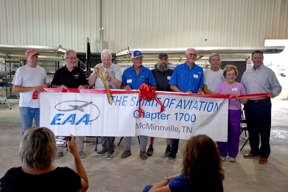 Rob Nunley photo - EAA Chapter 1700 President Jerry Lassiter cuts the ceremonial ribbon at the chapter's home at 422 Old Nashville Hwy. Thursday morning.