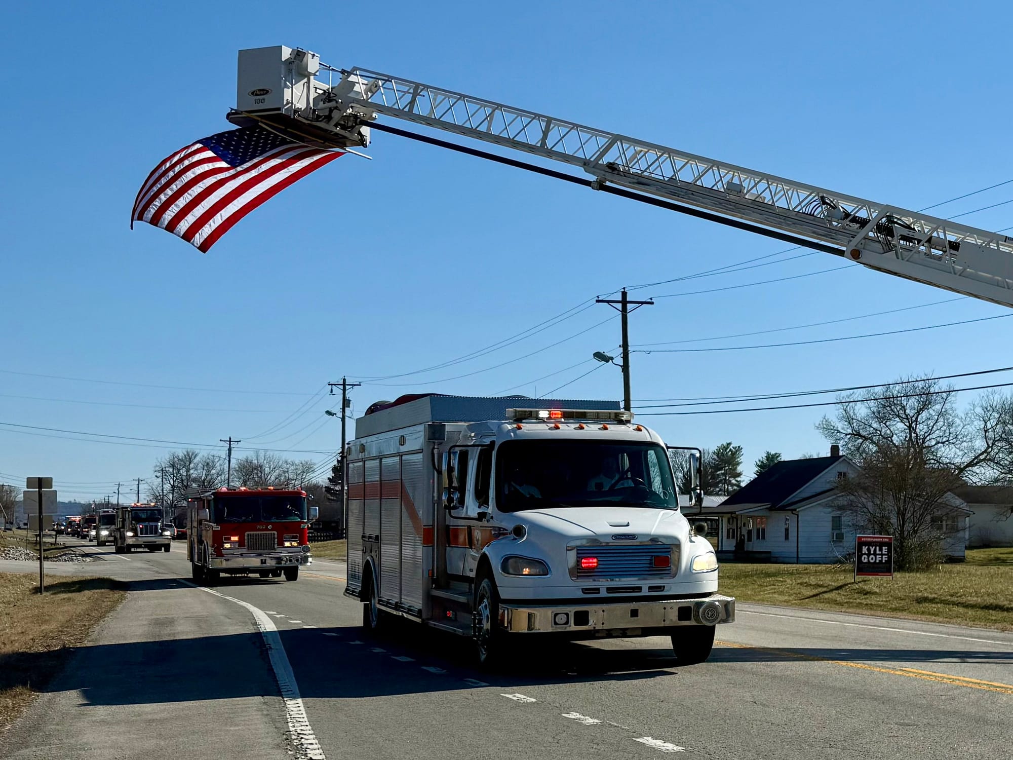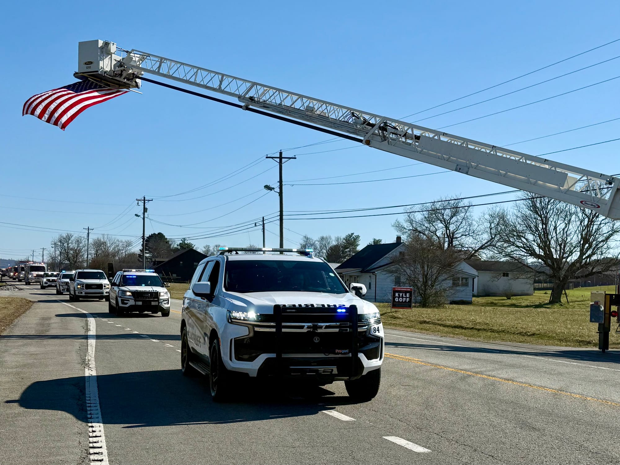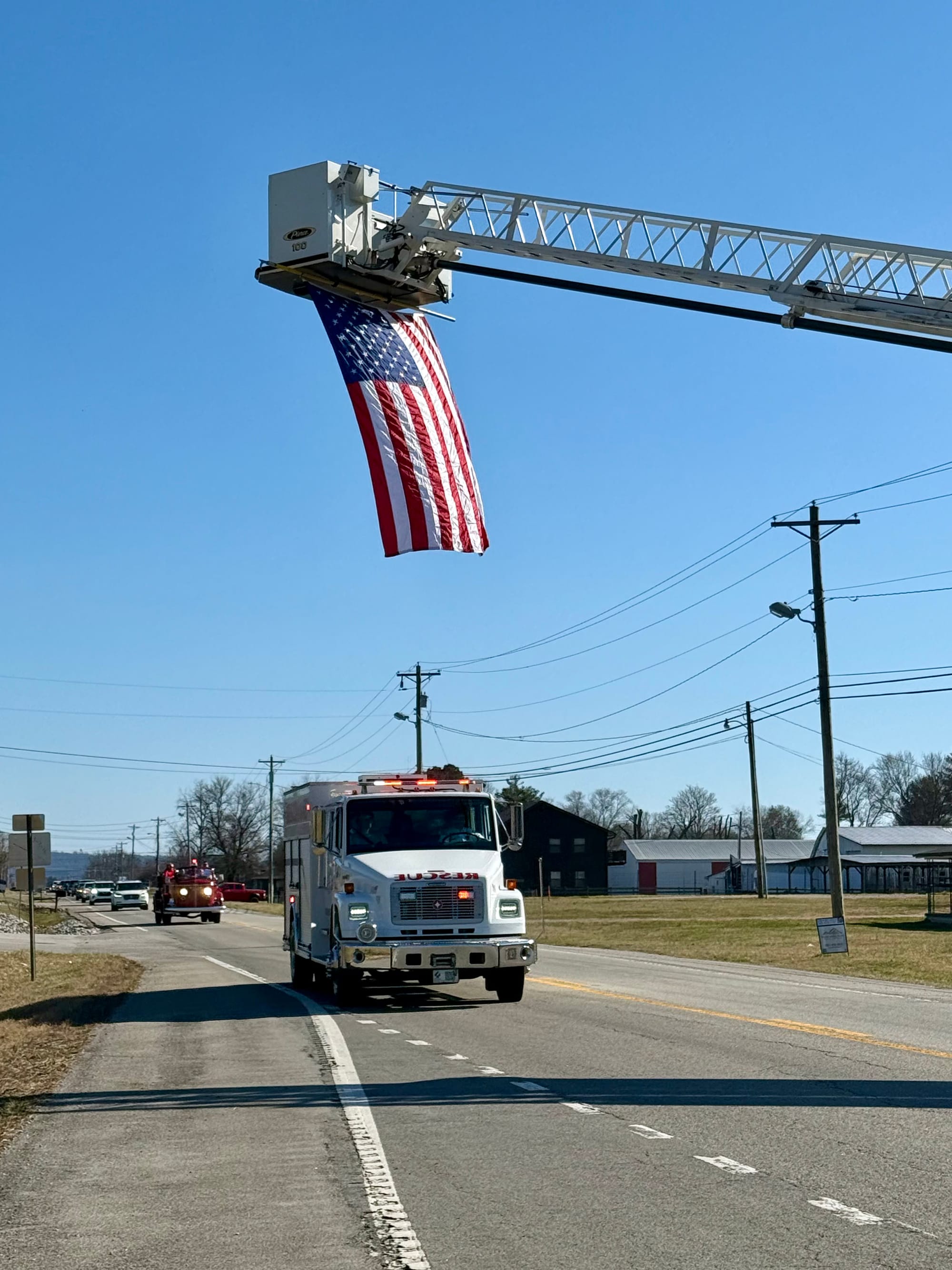 Emergency vehicles—police, sheriff’s deputies, rescue squad units, EMS, and fire departments from White County and neighboring counties—stood in solemn tribute. The Sparta Fire Department raised an American flag high over the roadway as Brown made his final journey, carried in the back of a fire engine. The scene was one of deep respect, gratitude, and love for a man who had given so much of himself to others.