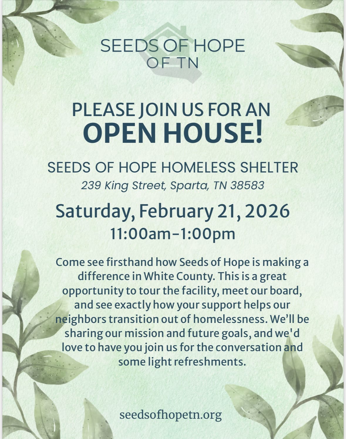 Seeds of Hope of Tennessee is inviting the community to take a closer look at the impact being made in downtown Sparta during an Open House this Saturday, February 21, from 11 a.m. to 1 p.m. at the Seeds of Hope Homeless Shelter, located at 239 King Street.