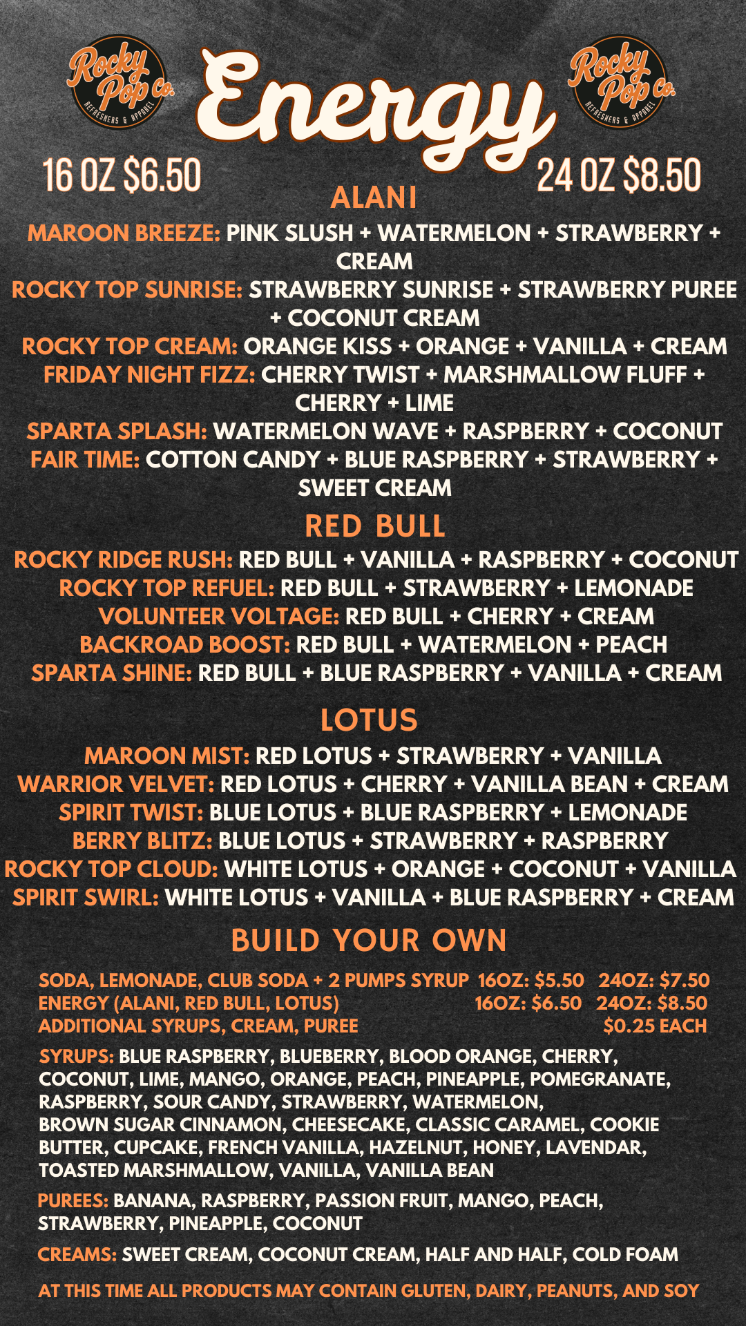 Coffee not your thing? Rocky Pop Co. also offers refreshers in the form of Dirty Sodas, Lemonades, and Energy Drinks from Dirty Alanis to Red Bull to Lotus.
