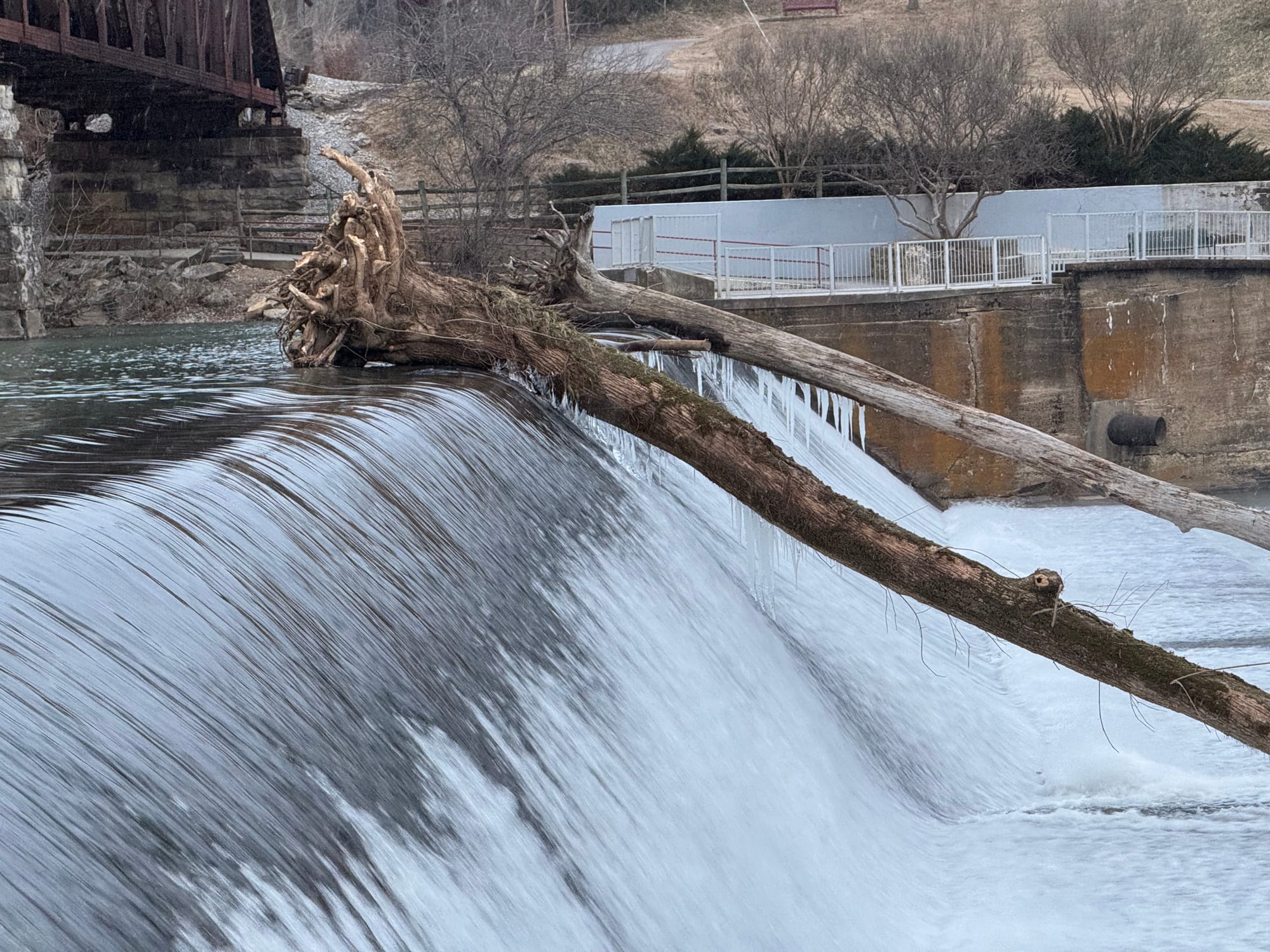 Snow was falling as steam was rising at Pepper Branch Park and Barren Fork River Dam Saturday evening as a severe weather advisory remains in effect for Warren County until noon Monday.