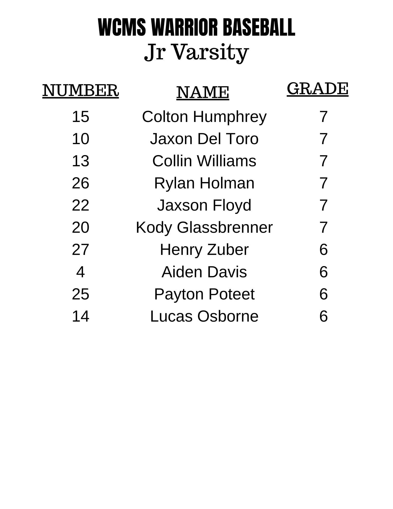 Pitching and defense are expected to be the backbone of this year’s Warrior baseball team. Eighth graders Jack Dicus and Noah Teeple will carry the bulk of district-game innings, but the coaching staff plans to rely on a full mix of 7th and 8th grade arms to get them through the schedule.