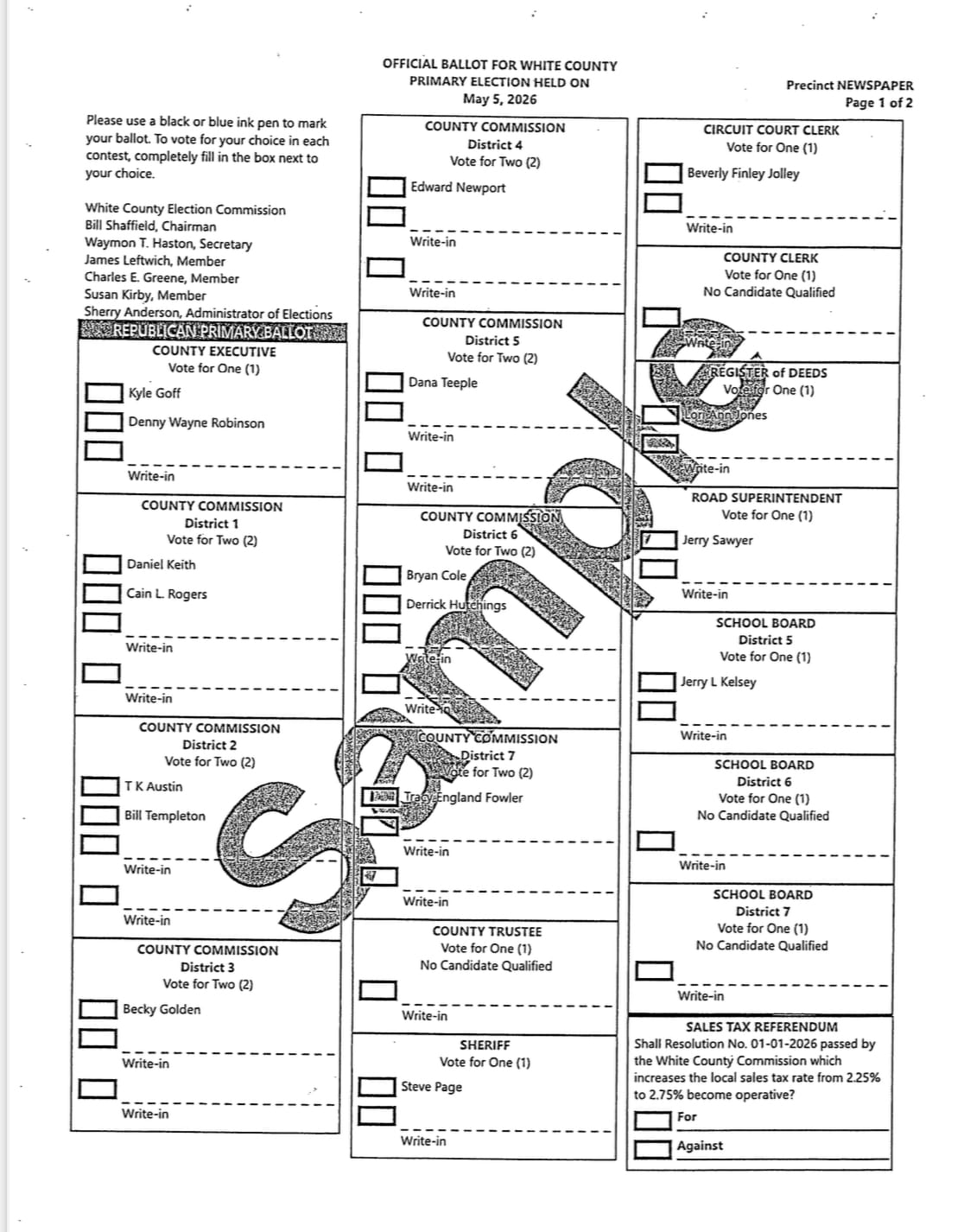 Do you wonder what the ballot will look like when you step into the voting booth? The sample ballots below show exactly what White County voters will see when they step into the booth for the May 5 primary election.