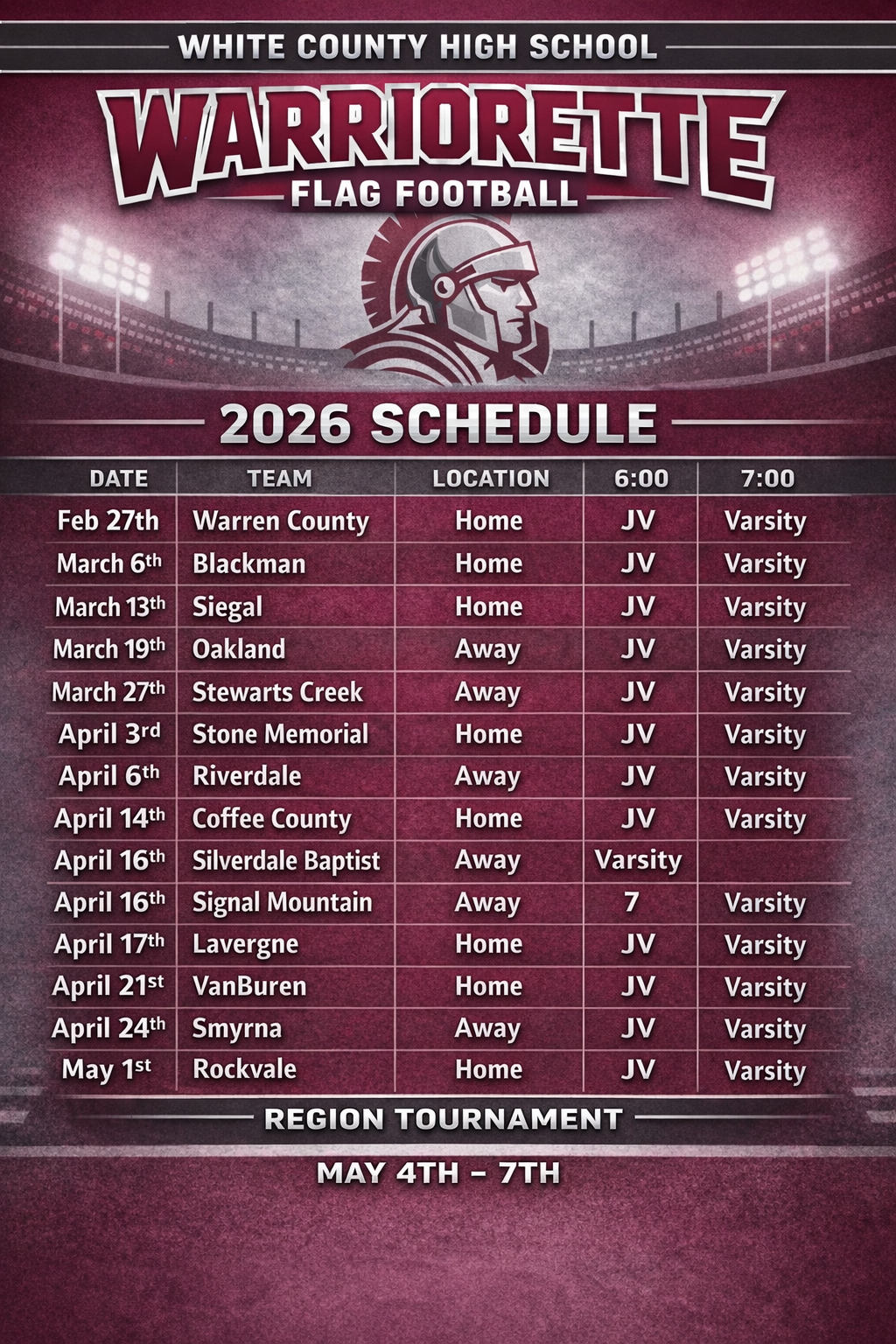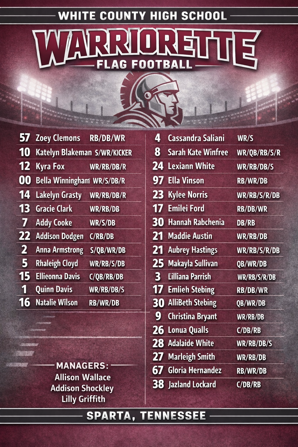 "They were excited and eager to play. They didn't know all the rules, but they were ready to represent the Warriors. And they became more excited when we had our first Warriorette receive a college scholarship. They loved getting to play in Warrior Stadium and hear their names called out as Warriorette Flag football players. We work to give them everything they need and a great field to play on. These young ladies are WCHS athletes and deserve the very best.” Wilson said, adding that after hearing some schools refused to let their flag football players on their football fields while others don’t even have a field available, White County stepped up to assist. “We have even let other schools use our field because they do not have a boy's football team. WCHS wants the sport to grow and give young ladies an opportunity to shine in the sport of Flag Football."