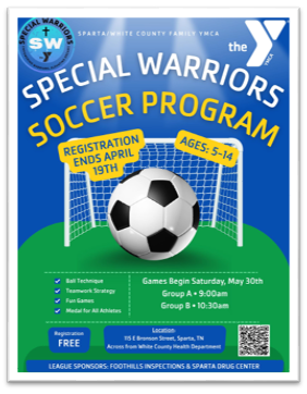 - Special Warriors Soccer Program - Registration for this program designed for anyone cognitively disadvantaged and looking for an all-inclusive opportunity is now open. Registration for athletes ages 2 - 14 will continue until April 19. Games and Clinics will begin May 30. Cost: FREE. Location: Soccer Fields on Walker Street in front of White County Health Department.